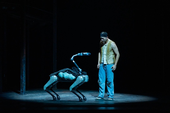 原著中,祥子觉得自己的腿很长、是最漂亮的车夫,于是,何念把舞台上的人力车去掉了轮子,全变成车夫的腿;整部戏的视觉中心,是一个11.5米高、3层铁笼结构的转台,戏中人物在8度的斜坡上来回游走,但“下层”的人始终走不到“上层”。戏中最有风格的道具,或者说“演员”,是一只“机械骆驼”——工业级机器狗,它既是情节的一部分,也是祥子的化身,而机器的笨重和呆滞,暗合了人物的命运走向。