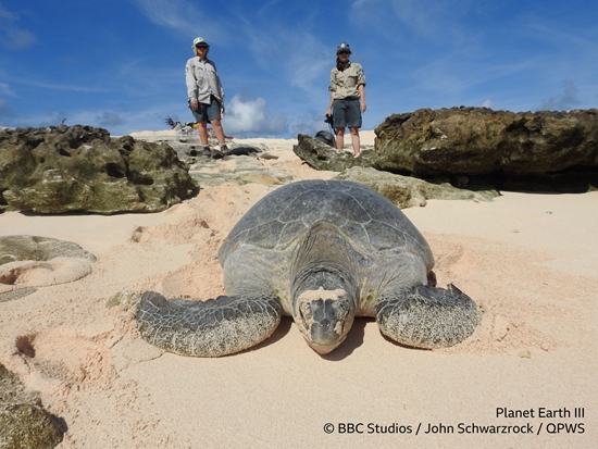 包括他1957年去过的雷恩岛——太平洋里有一半的绿海龟会到雷恩岛产卵,这个产卵习惯已经沿袭了上千年,雷恩岛是世界上最大的绿海龟筑巢地。大卫·爱登堡是第一批抵达雷恩岛的人类,当时的胶片记录了他偶遇一只成年绿海龟和一只刚出生的小绿海龟。