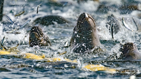 南美海狮跳进渔网里,你挤我撞地吃鳀鱼。