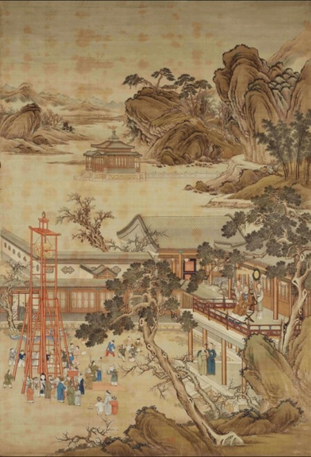 其中最有特色的,是“岁朝行乐”类图像,其为皇帝个人生活的纪实类画作,记录了节庆期间宫廷庆贺及生活场景。这类图像通常尺幅较大,作为“贴落”存在,即其功能之一在于作为贴在墙上的建筑物装饰绘画存在,有“瑞牒祥图,珍符彪炳”的政治寓意。