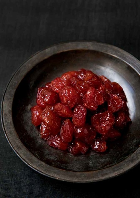 再说诸色“蜜煎”。蜜煎即蜜饯,用果子加大量蜂蜜煎煮而成,使蜜汁渗透果肉,口感甜腻,常被用作茶酒果。当时流行的蜜煎品类繁多,甚至有镂以花的“雕花蜜煎”。比如,蜜煎樱桃、蜜煎橄榄、蜜煎金橘、雕花梅球儿、雕花笋、雕花红团花、雕花金橘、雕花橙子、雕花姜、蜜冬瓜鱼儿、木瓜方花儿。“糖煎”,制法如蜜煎,只是将蜂蜜换作赤砂糖。此外,还有用盐和香料炮制类似于盐津橄榄的“咸酸果子”,以及外层裹了糖粉的“珑缠果子”。