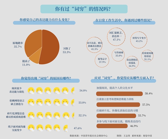 沟通交流是人际互动的重要方式。语言和文字表达的背后是思维和认知。随着网络媒介的发展,依靠流行语、表情包就能“直抒胸臆”,但这种浅白直接的输出方式,让一些复杂深邃的表达逐渐被遗忘。在离开网络环境、需要进行规范化表达时,一些年轻人只剩下了干瘪的文字和磕绊的语言。近日,中国青年报社社会调查中心的一项调查显示,超半数受访青年感觉近几年自己的语言文字表达能力下降,47.1%的受访青年感觉自己词汇量匮乏、表达单一。为什么在青年群体中出现了“词穷”的现象?如何丰富自己的语言,让“梗阻”的表达顺畅起来?中青报·中青网记者采访了多位年轻人和相关领域专家,共同探讨这一问题。