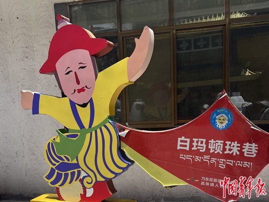 走进位于西藏自治区山南市乃东区昌珠镇的扎西曲登社区,在路口就能一眼看见“藏戏之乡 文化瑰宝”的标语,还有一个大大的藏戏面具图案。这里的每个角落都能感受到藏戏的气息:带有藏戏面具元素的灯牌、以藏戏传承人名字命名的街巷、以藏戏鼓为原型做成的垃圾桶、画着藏戏面具的门帘……