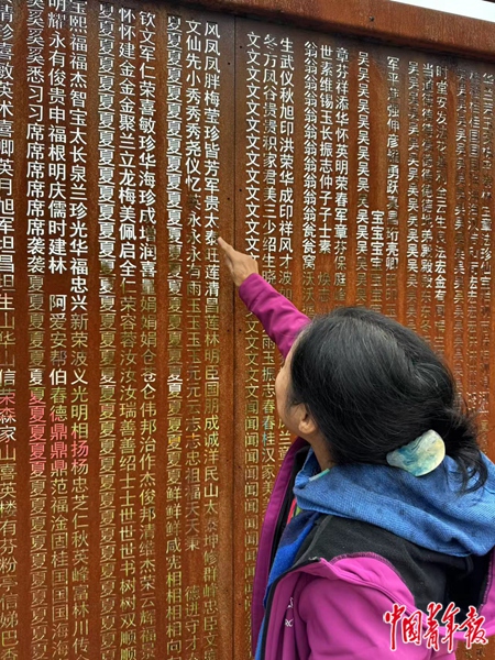 “核二代”夏鹏重返金银滩,在“596”长廊上找到父亲夏永泰的名字。胡春艳/摄