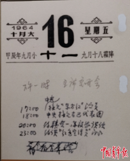 青海原子城纪念馆展出的周恩来总理1964年10月16日的日程表。他在接见《东方红》演职人员时宣布了第一颗原子弹爆炸成功的消息。张国/摄