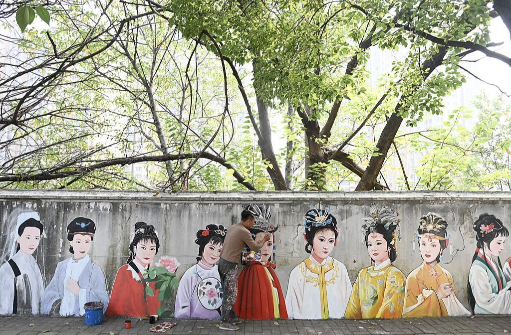 画师长沙街头墙绘87版《红楼梦》经典角色致敬传统文化