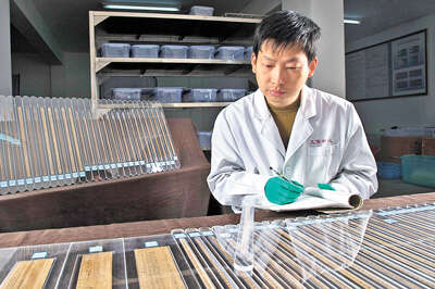 湖北荆州文物保护中心工作人员对修复完成的简牍进行记录。新华社记者 熊 琦摄