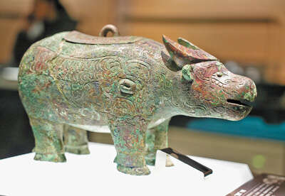 河南安阳殷墟博物馆内展出的亚长牛尊,是目前殷墟发现的唯一一件牛形青铜尊。本报记者 张文豪摄