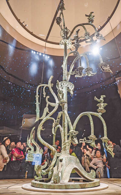 四川广汉三星堆博物馆内,观众围在Ⅰ号大型铜神树前仔细观看。Ⅰ号大型铜神树由底座、树和龙三部分组成,体现了高超的冶铸技术和艺术水平。本报记者 宋豪新摄
