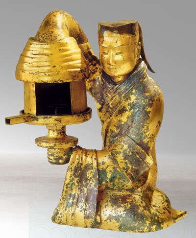 长信宫灯。1968年出土于河北保定满城汉墓,形状为跪地执灯的宫女,通体鎏金。灯盘可转动,以调节灯光亮度和照射方向,灯身人物中空的衣袖和身体作为通道用于排烟。河北省博物院供图