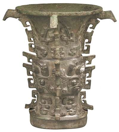 何尊。西周早期的青铜酒器,器型上圆下方,体现古人“天圆地方”的宇宙观。腹底有铭文12行122字,其中的“宅兹中国”是“中国”一词最早的文字记载。图片为陕西宝鸡青铜器博物院提供