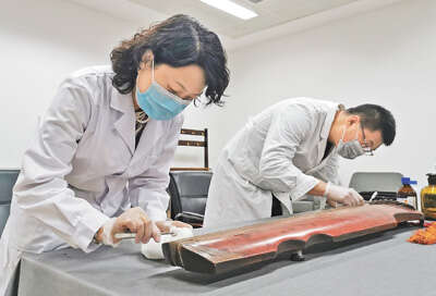 辽宁省博物馆工作人员在对九霄环佩琴进行保养。九霄环佩琴制作于唐代。在古琴琴底,镌刻着“九霄环佩”四个字。琴面上,镶嵌着13个由蚌壳制成的圆点,起到标记琴弦音位的作用。朱忠鹤摄(影像中国)