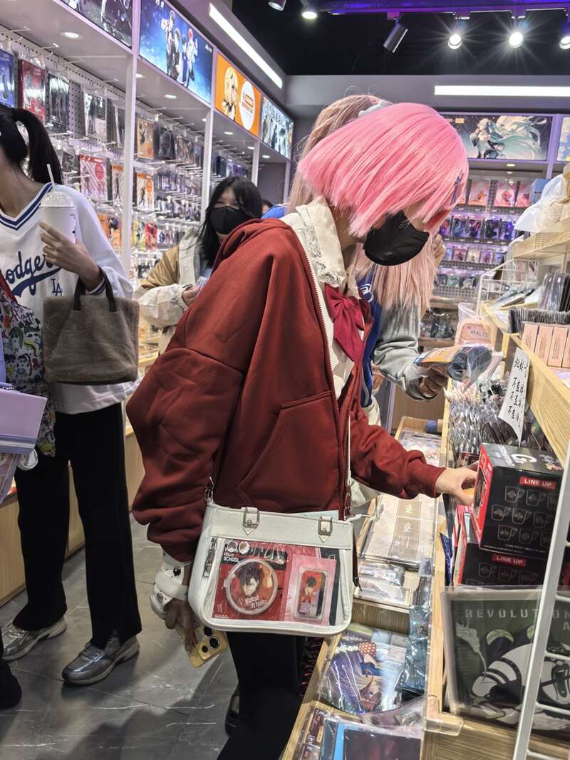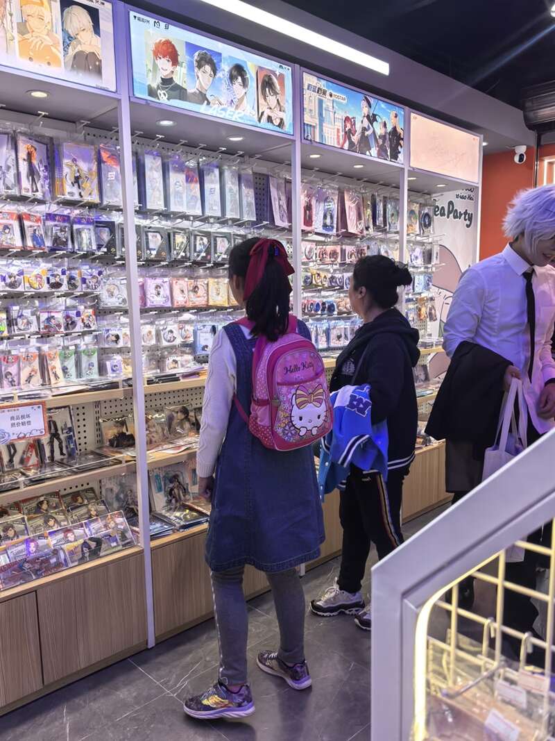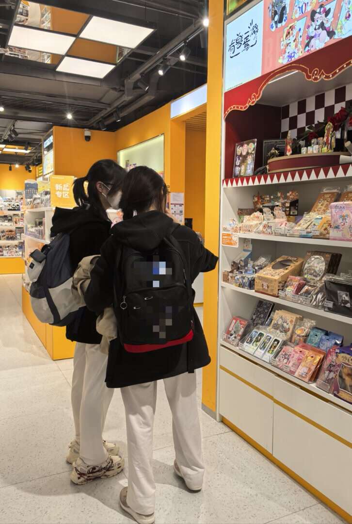 “这个‘吧唧’真好看!我得看看我的钱还够再买几个。”一家二次元潮玩店铺里,16岁的高中生小冉正跟同伴一起挑选徽章。在她手上,还攥着四五个已经选好的亚克力立牌。不远处,11岁的小学生嘉嘉则在妈妈的陪同下,考虑要不要入手一款热门IP的玩偶。