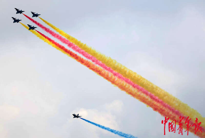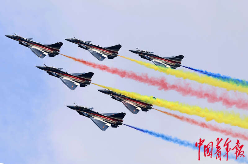 11月11日,中国国际航空航天博览会会场,空军八一飞行表演队在珠海国际航展中心表演编队飞行。11月11日是人民空军成立75周年纪念日,也是第十五届中国国际航空航天博览会开幕的前一天,空军八一飞行表演队和空军航空大学“红鹰”飞行表演队进行了一场美轮美奂的飞行表演。