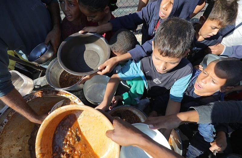 加沙地带:巴勒斯坦儿童等待慈善组织分发餐食