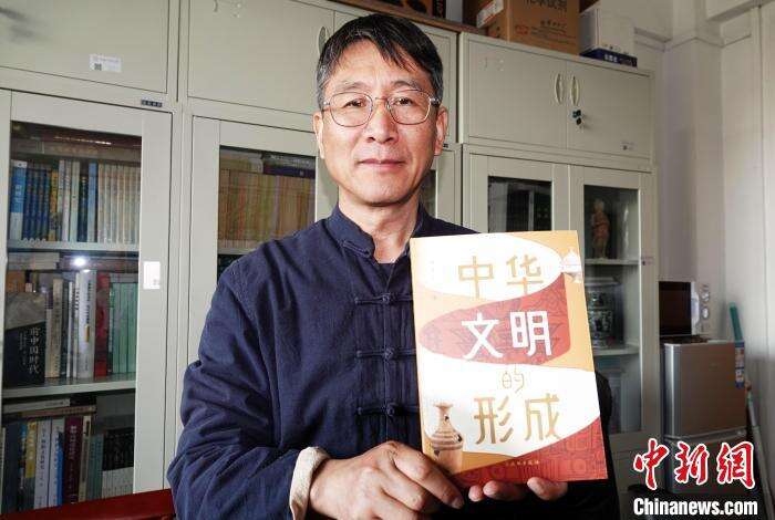 韩建业教授在办公室展示他最新出版的考古研究学术专著《中华文明的形成》。中新网记者 孙自法 摄