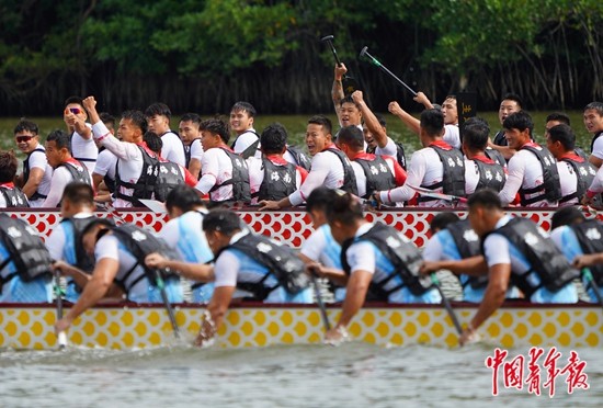 11月23日上午,海南三亚河,第十二届全国少数民族传统体育运动会标准龙舟男子直道竞速1000米决赛,贵州队获胜后振臂欢呼庆祝。