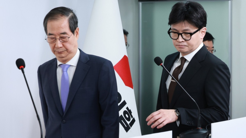 当地时间8日,韩国国务总理韩德洙与执政党国民力量党党首韩东勋举行会见并就韩国政局等发表共同谈话。