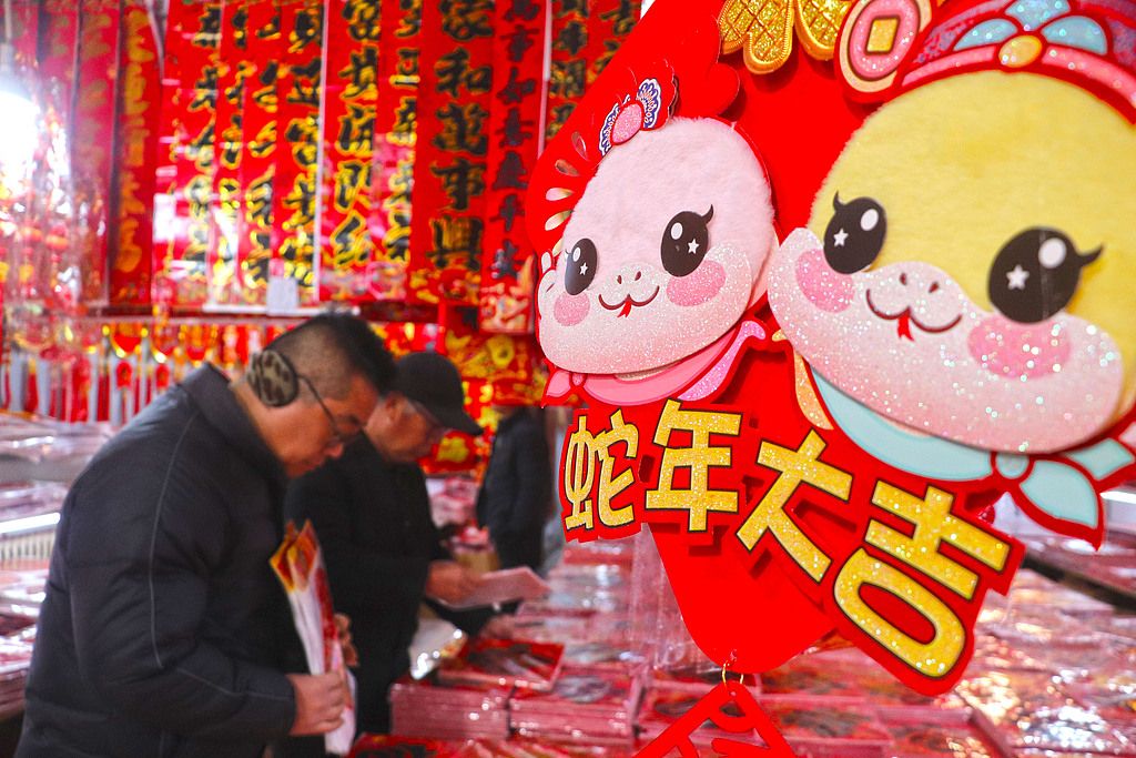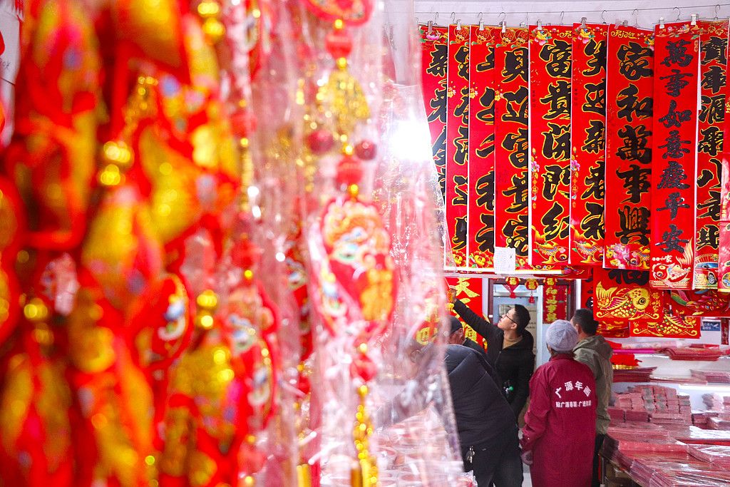 2024年12月11日,在山东省高密市夏庄镇东李村,客商在选购新春饰品。