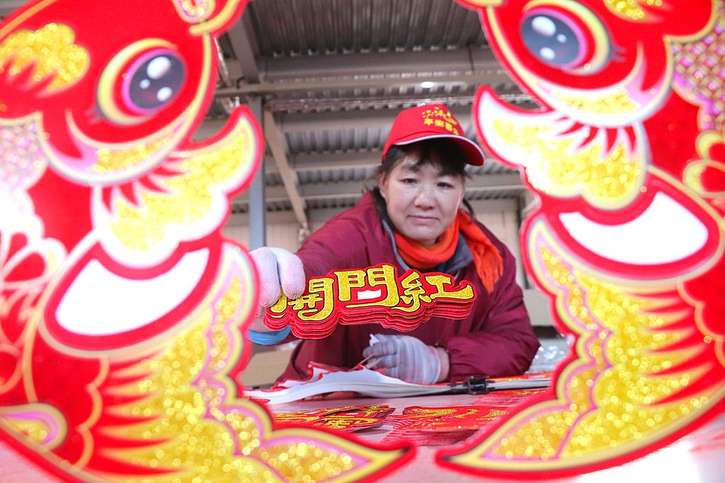 2024年12月11日,在山东省高密市夏庄镇东李村,村民在加工新春饰品。