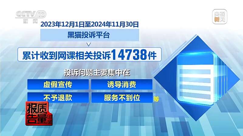 记者在公益性消费者服务平台“黑猫投诉”了解到,2023年12月1日至2024年11月30日,黑猫投诉平台累计收到网课相关投诉14738件。投诉问题主要集中在虚假宣传、诱导消费、不予退款、服务不到位等。