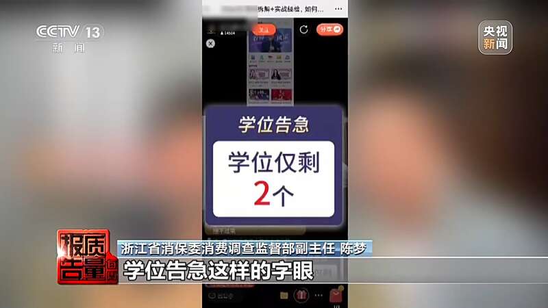 浙江省消保委消费调查监督部副主任 陈梦:主播不断在直播间推销价值14800元的课程,并且直播间不断弹出“学位仅剩两个”“学位告急”这样的字眼来营造紧张气氛,消费者在这种气氛下就很容易冲动购买。