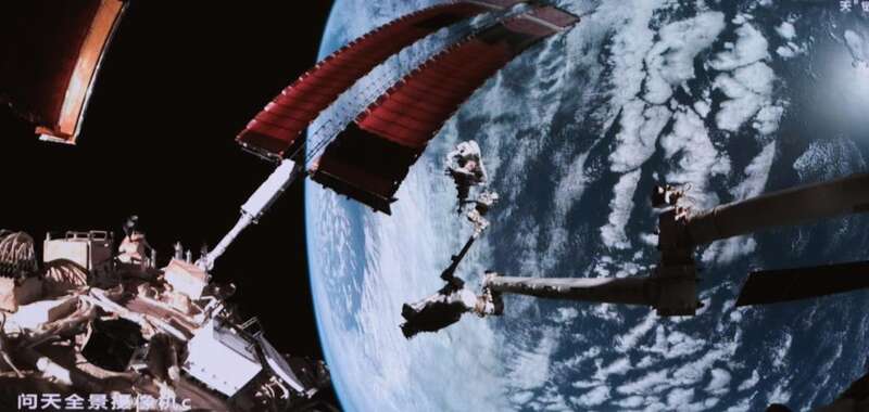 2024年5月28日在北京航天飞行控制中心拍摄的神舟十八号航天员叶光富在空间站机械臂辅助下进行舱外作业的画面。新华社记者 李杰 摄