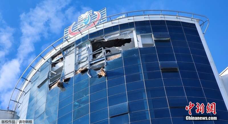 当地时间12月22日,救护直升机与医院大楼相撞后,医院楼体出现损坏。