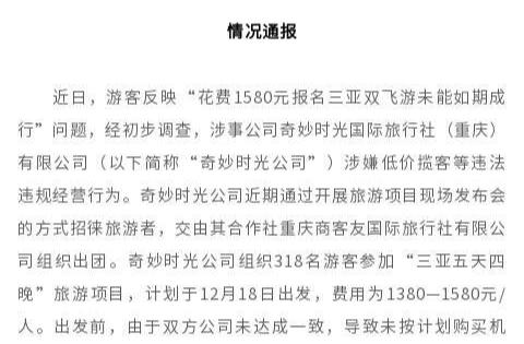 重庆对涉嫌低价揽客公司立案:290余名游客已被陆续安排返家