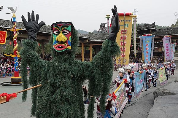 2024年12月22日,广西柳州,在融水苗族自治县融水镇梦呜苗寨,一位“同年”扮成“芒篙”巡游。