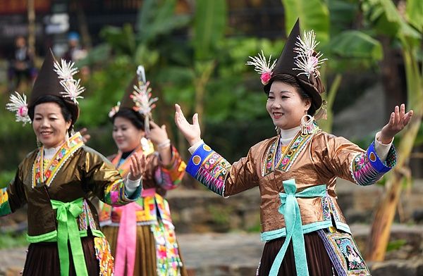 2024年12月22日,广西柳州,在融水苗族自治县融水镇梦呜苗寨,苗家女在“打同年”活动中表演节目。