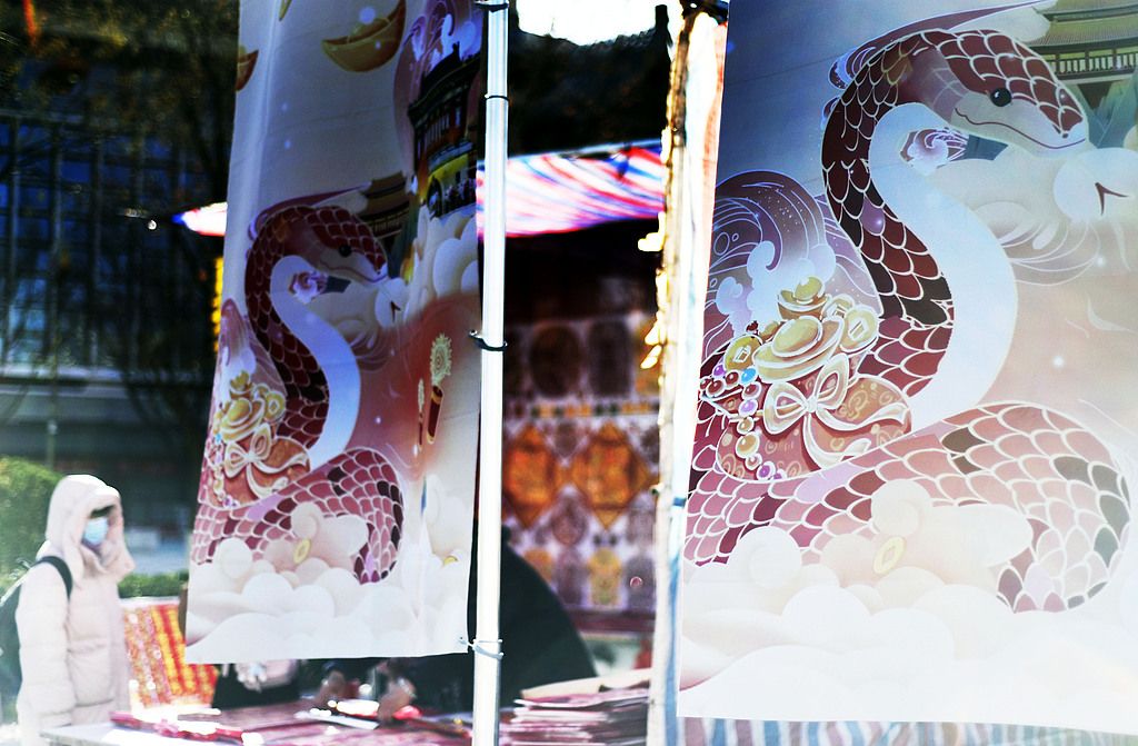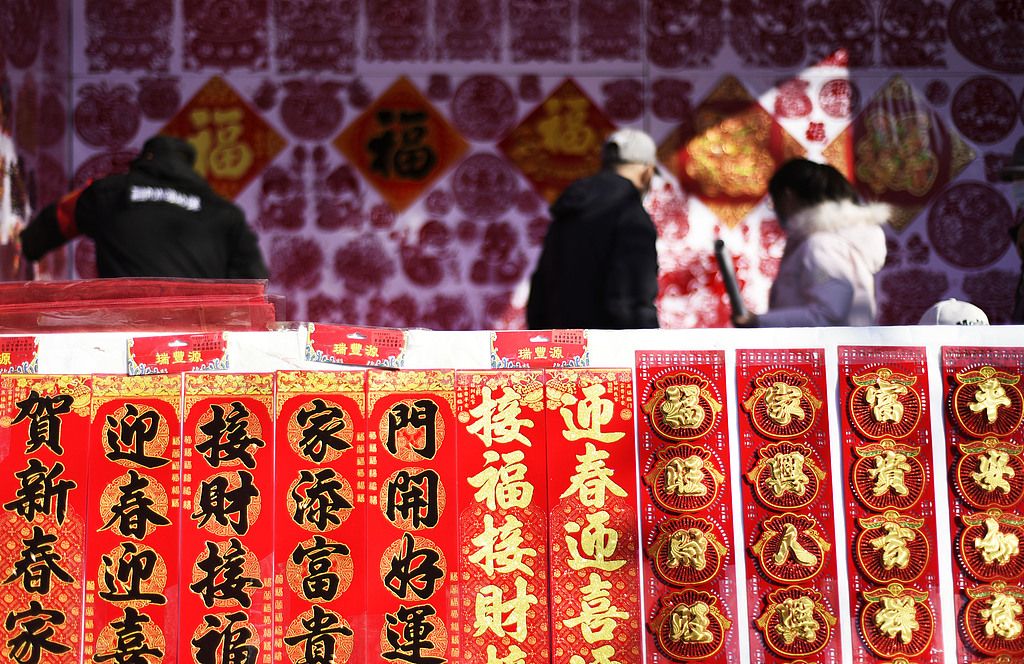 2024年12月23日,天津古文化街玉皇阁前广场,热热闹闹、红红火火的农历蛇年春节文化年货市场人来人往,吊钱儿、福字、剪纸、春联、绒花……各式各样的文化年货琳琅满目,挂满了市场的每一个角落。近日,天津古文化街吊钱儿市场正式拉开帷幕,为即将到来的乙巳新春提前预热,吸引了市民游客前来体验传统年俗,感受那份久违的春节的热闹与喜庆。