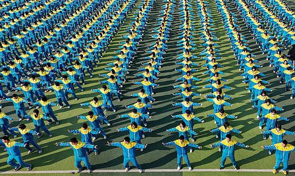 2024年12月24日,河北沧州,河间英华学校初中部三年级的学生在课间练习八段锦(无人机照片)。