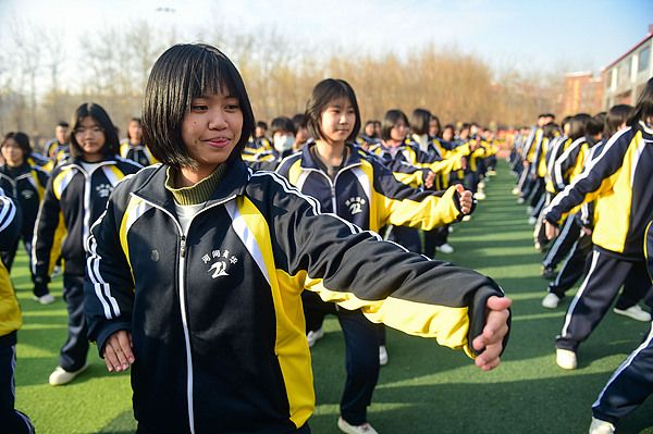 河北沧州:初中生课间练习八段锦 传承中华健身文化