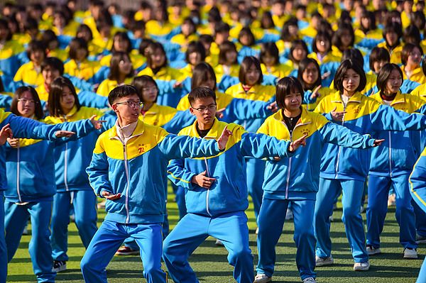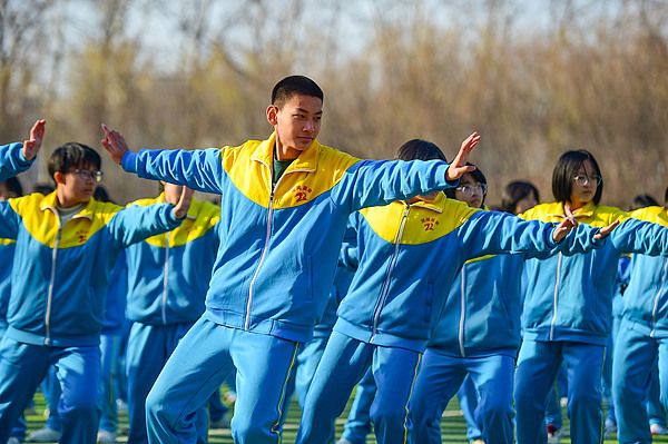 2024年12月24日,河北沧州,河间英华学校高中部已年级的学生在课间练习太极拳招式。