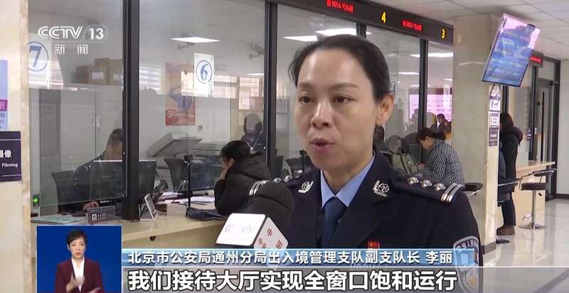 北京市公安局通州分局出入境管理支队副支队长 李丽:日常特别是周六,我们接待大厅实现全窗口饱和运行,全员在岗在位,最大限度减少群众排队等候。