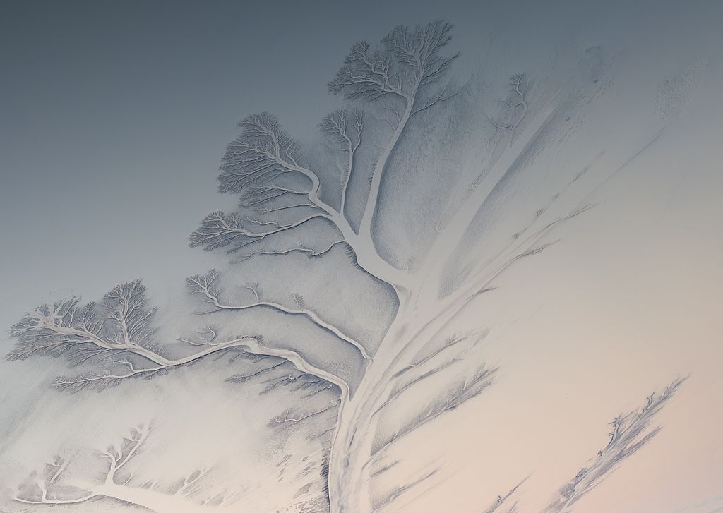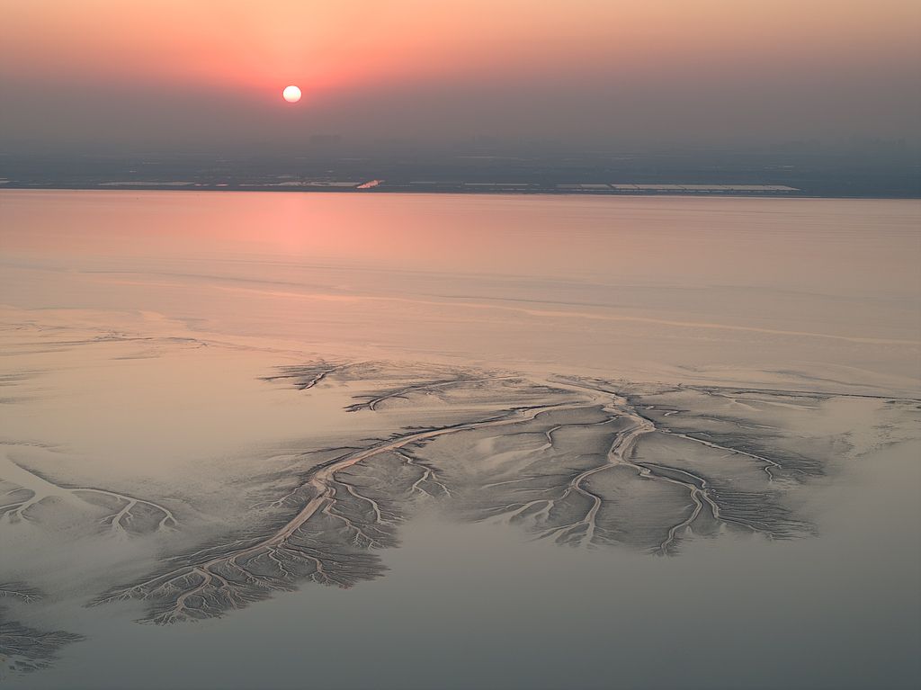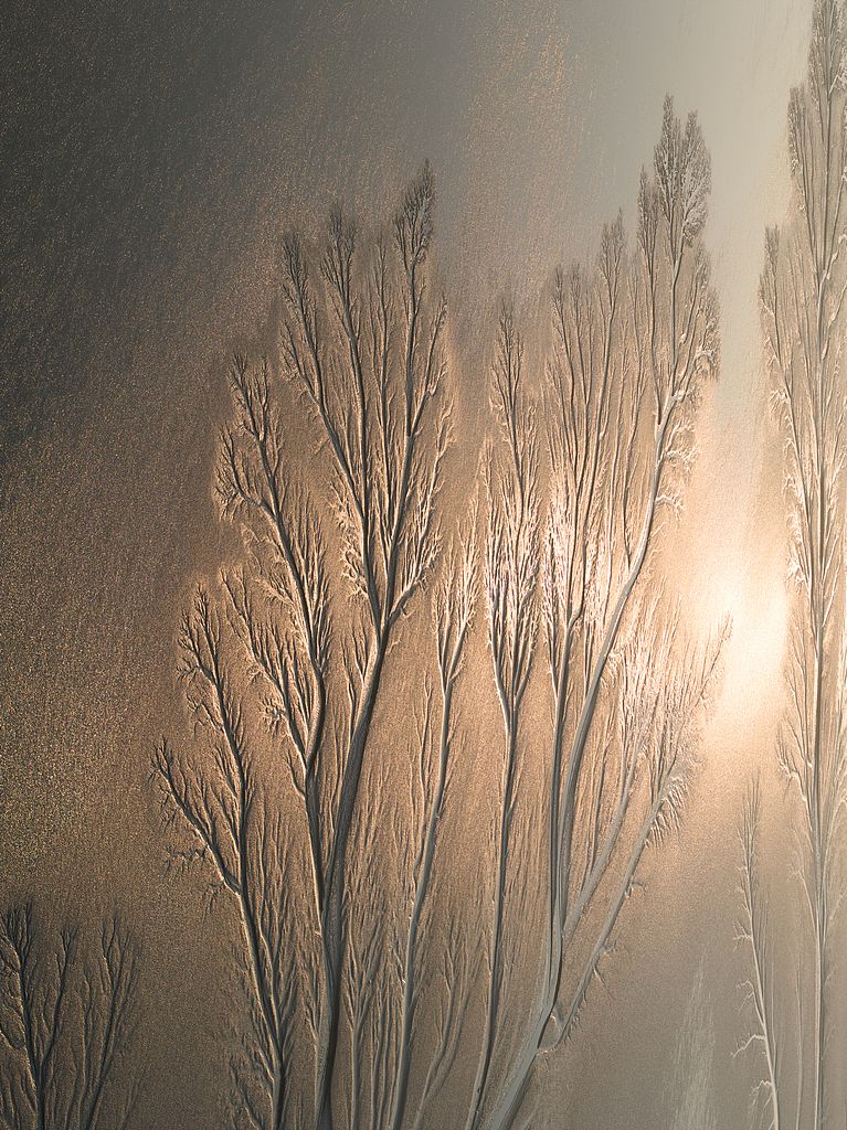 2024年12月15日-18日,浙江嘉兴海宁市钱塘江潮汐在潮起潮落之间形成一棵棵造型各异的巨型潮汐树,在朝阳或夕阳映射下瑰丽无比。