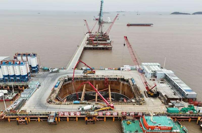 杭州湾跨海铁路桥首个航道桥主塔承台施工完成