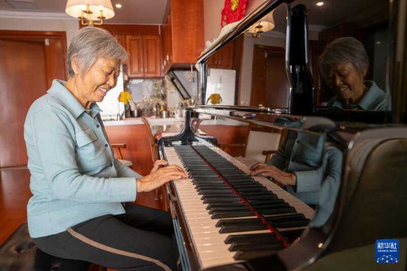 2024年11月11日,在山东省日照市泰安路社区养老服务中心,一位老人在居室中弹钢琴。