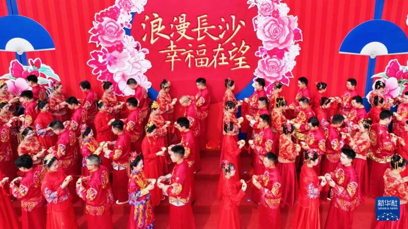 2024年8月10日,新人们在湖南长沙铜官窑文化旅游度假区参加集体婚礼(无人机照片)。