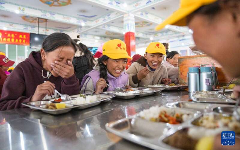 2024年6月22日,西藏那曲市班戈县中石化小学的学生在食堂用餐。班戈县中石化小学是由中石化集团结对帮扶建立的,2012年投入使用。