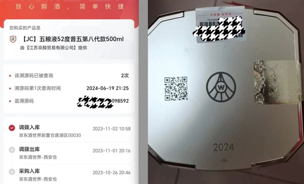 然而收到货后,陈先生扫描外包装上的溯源码时却发现,采购日期竟早于购买日期。他提供的截图可见,扫描溯源码后显示,该酒品于2023年10月26日采购入库,并在2023年11月进行过两次调拨出库、调拨入库。但外包装上的生产日期却显示,该酒产于2024年。