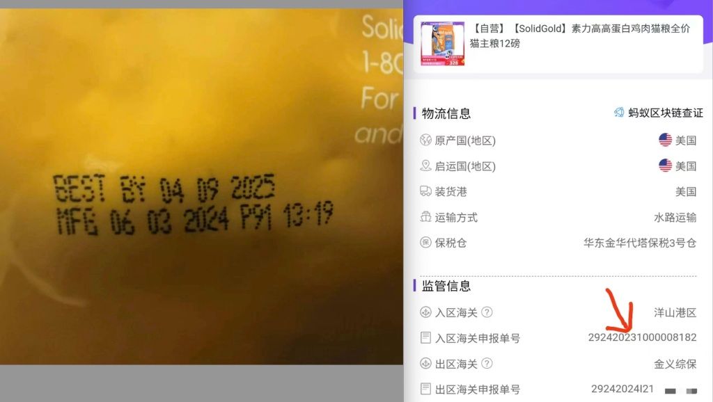 猫粮生产日期为2024年6月,溯源码显示入关日期为2023年。