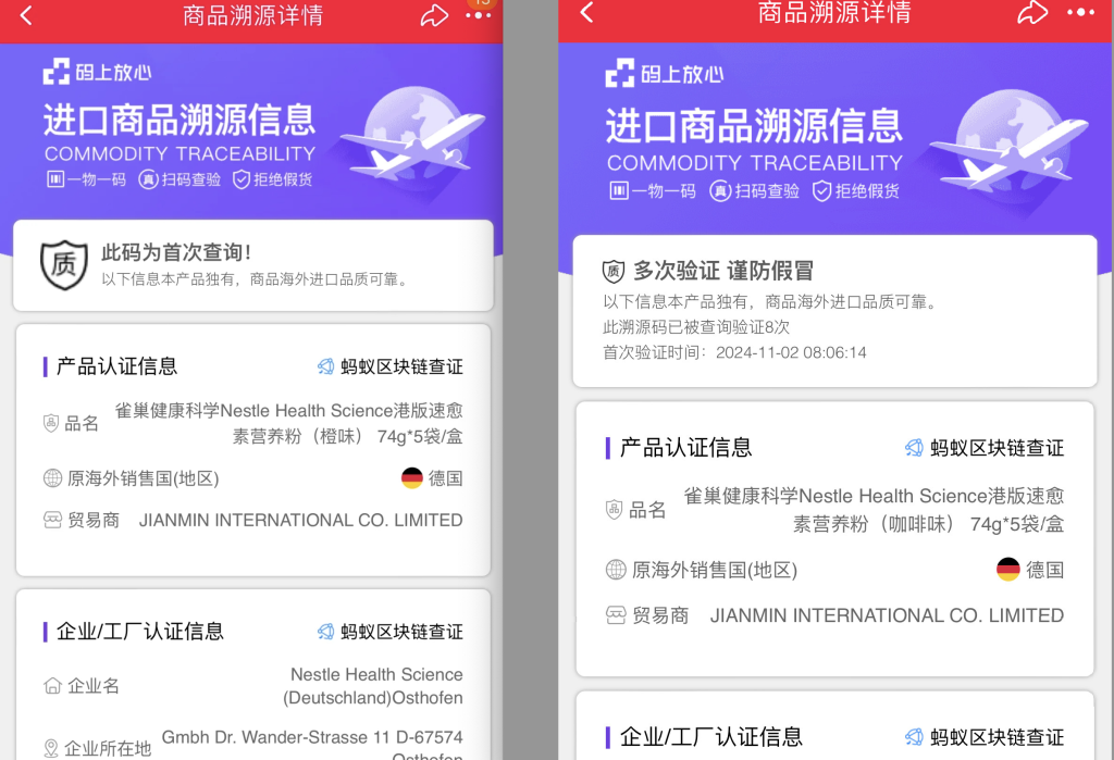 李女士说,回家后她扫描外包装上的“天猫国际进口商品溯源码”。让她诧异的是,自己买的营养粉是咖啡味,但溯源码上的产品名称却显示是“橙味”。