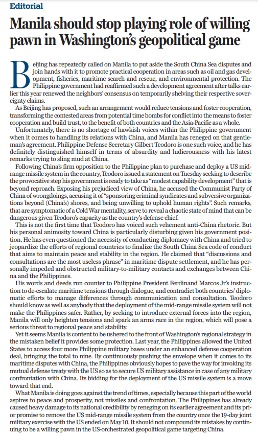亚太地区渴望和平与繁荣,而不是战争和对抗,菲律宾的做法违背时代趋势。菲律宾背弃早先协议,未按承诺在5月10日与美国为期19天的联合军事演习结束后撤出美国中程导弹系统,已经严重损害国家信誉。菲律宾不应再继续充当美国针对中国的地缘政治博弈中的棋子,以免错上加错。
