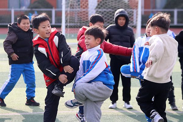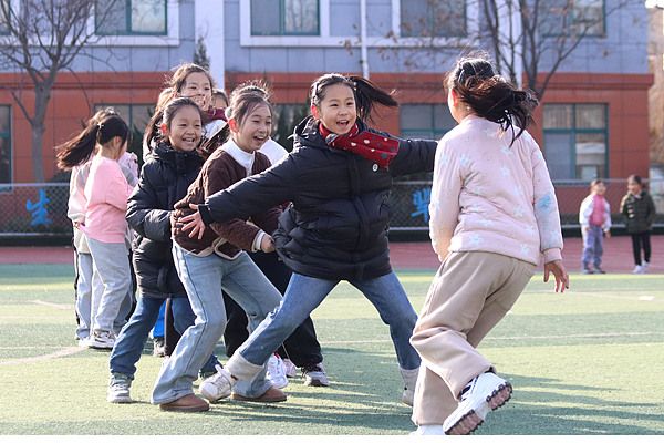 2024年12月27日,在山东潍坊高密市恒涛实验小学,孩子们在玩老鹰捉小鸡游戏。