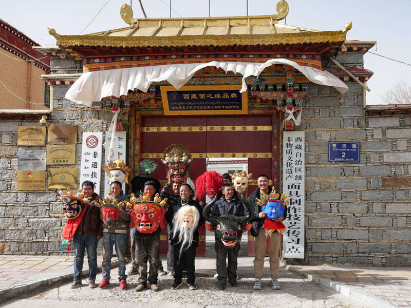 在拉萨达孜区雪乡民间传统手工艺农民专业合作社的小院里,西洛和徒弟们忙得热火朝天,他们正在制作西藏传统面具。面具制作工序繁杂,制作一个面具包括雕刻、分层、风干、喷漆等十几道工序,需要10多天才能完成。徒弟们各司其职,西洛紧盯徒弟们的一举一动,不时上手帮忙,力求每一张面具都能完美出品。