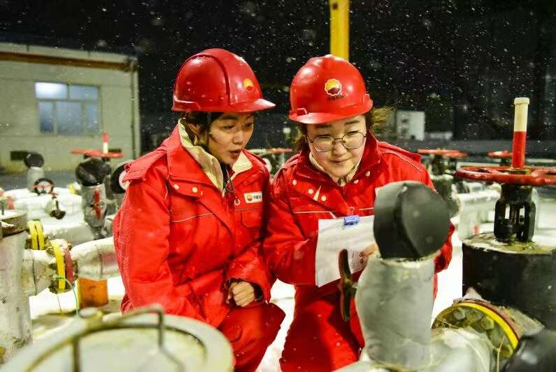 漫天风雪中,长庆油田青年员工加密巡检,确保冬季设备高效平稳运转。杨红梅/摄影