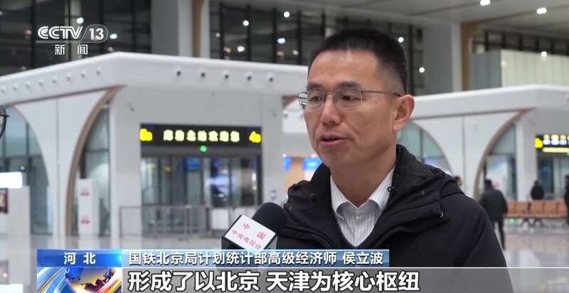 国铁北京局计划统计部高级经济师 侯立波:京津冀地区铁路网密度不断加大,形成了以北京、天津为核心枢纽,覆盖联通河北省所有地级市的高速铁路网。区域内高铁运营里程达2669公里,首都都市圈1小时通勤、京津冀城市群主要城市间2小时通达交通圈基本形成。