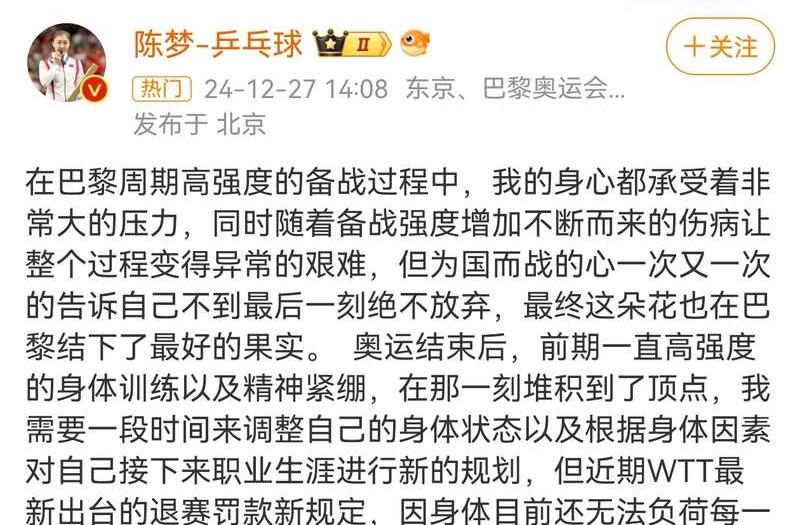 紧跟樊振东之后,陈梦也宣布退出世界排名